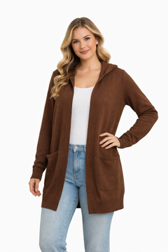 A cozy, throw-on hooded cardigan that nails off-duty chic. The soft knit feel, relaxed cut, and roomy front pockets deliver effortless drape and all-day comfort.