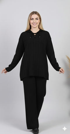 A cozy, throw-on ribbed knit set that nails off-duty chic. The relaxed longline top, lace-up collar detail, and flowy wide-leg pants deliver effortless drape and all-day comfort.