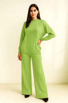Design: Oversized sweater with cable-knit details, wide-leg pants with elastic waistband